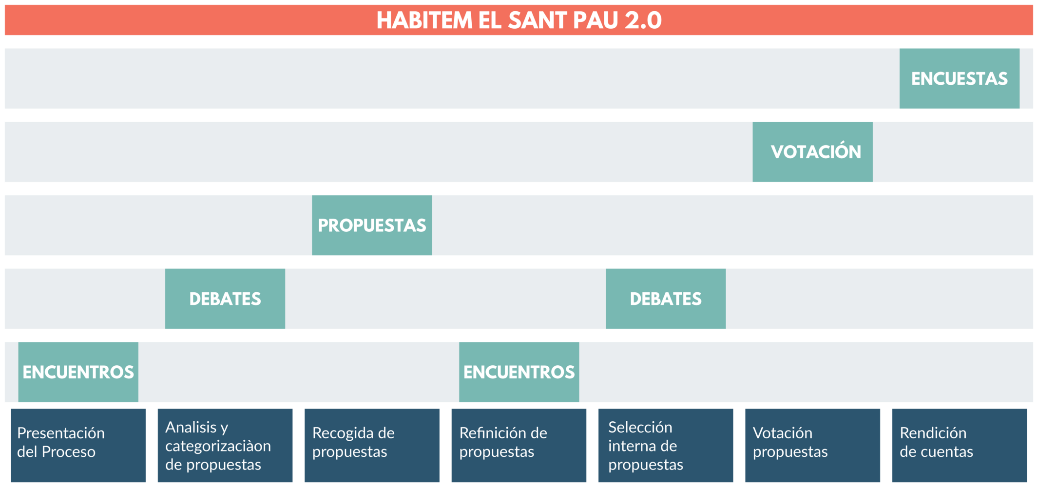 # **contexto** El Gimnasio Social Sant Pau es mucho más que un gimnasio, es un símbolo de la lucha a la gentrificación y del sentimiento de comunidad del barrio del Raval. Por su configuración, casi 30 metros de planta baja y piso sobre la calle, resulta ser muy atractivo para el capital inmobiliario en uno de los barrios más castigados por la gentrificación y donde no hay vivienda pública. La cooperativa que lleva la gestión del gimnasio a finales del 2017 ha lanzado una iniciativa en DECIDIM.Barcelona [https://www.decidim.barcelona/initiatives/i-8?locale=ca] con el objetivo de adquirir la parcela de Ronda Sant Pau para “contrarrestar la expulsión de vecinas de los barrios” proponiendo un proyecto justamente ambicioso: la construcción de 50 viviendas públicas e inclusivas y garantizar la continuidad de la acción solidaria y comunitaria del proyecto Gimnasio Social Sant Pau [https://straddle3.net/es/proyectos/habitem-el-sant-pau]. # **escenario** QUÉ PASARÍA SI… el Gimnasio Social Sant Pau PUDIERA... crear un proceso participativo CON... encuentros, debates y propuestas entre todos los socios del gimnasio social y los habitantes del Raval PARA… pensar un proyecto de vivienda pública que contrarreste la gentrificación del Raval # **descripción** Cómo se podría haber pensado junto a los habitantes del Raval el futuro proyecto de vivienda pública en el Sant Pau? Después de la iniciativa en DECIDIM se podía haber hecho también un PROCESO para la definición de un programa de recupero: 1. Antes de todo una PRESENTACIÓN DEL PROCESO y de los resultados de la primera iniciativa en un encuentro público. El Sant Pau se encuentra entre tres barrios con ciudadanía muy activa, por lo tanto se utilizará uno de los espacios donde habitualmente se generan encuentros entre los vecinos. 2. A seguir, antes de abrir el proceso hacia una recogida de propuestas es necesario debatir (internamente) para una CATEGORIZACIÓN DE LAS PROPUESTAS que se pueden aceptar. 3. Una vez abierta la fase de RECOGIDA DE PROPUESTAS se piensa hacer un encuentro público con todos los proponentes para preparar la siguiente fase. 4. REFINAMIENTO DE LAS PROPUESTAS. 5. Un equipo formado por usuarios y gente con conocimiento técnico se encargará de hacer un debate interno para SELECCIONAR LAS PROPUESTAS que llegarán a la siguiente fase. 6. VOTACIÓN. 7. Se piensa que el resultado del proceso hasta este punto podría haber generado unas ideas concretas que tendrían que cumplirse y por eso en última fase se seguirá la ejecución del proyecto con una RENDICIÓN DE CUENTAS. #demo #openspaces